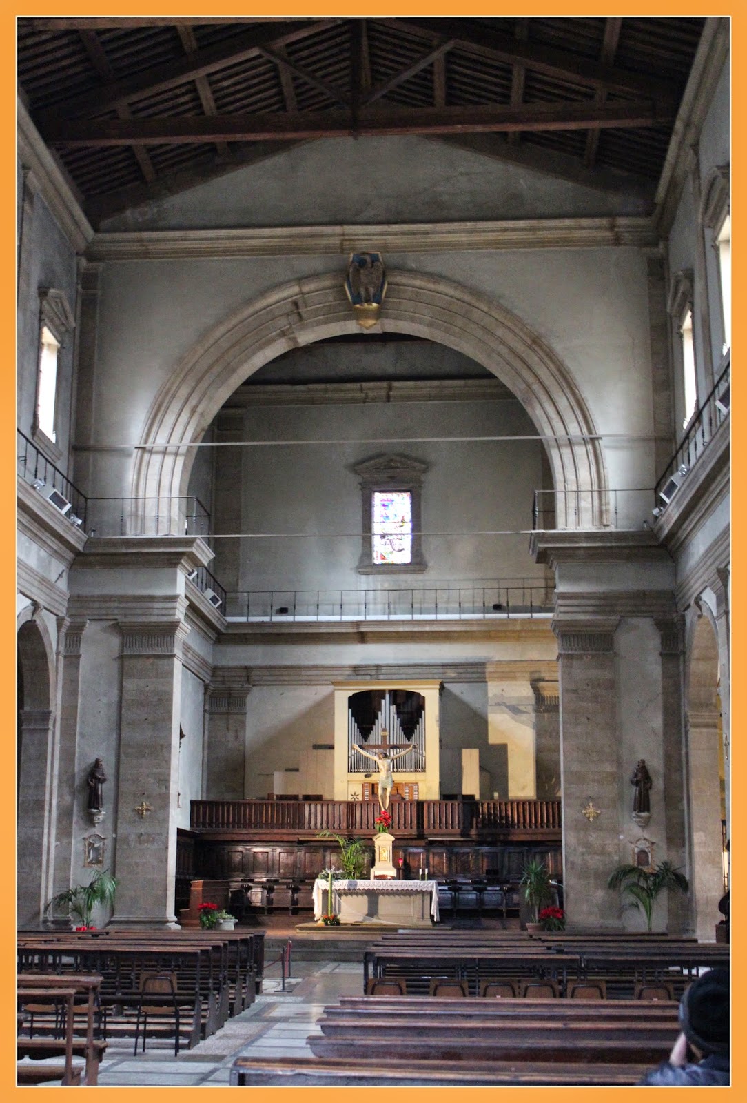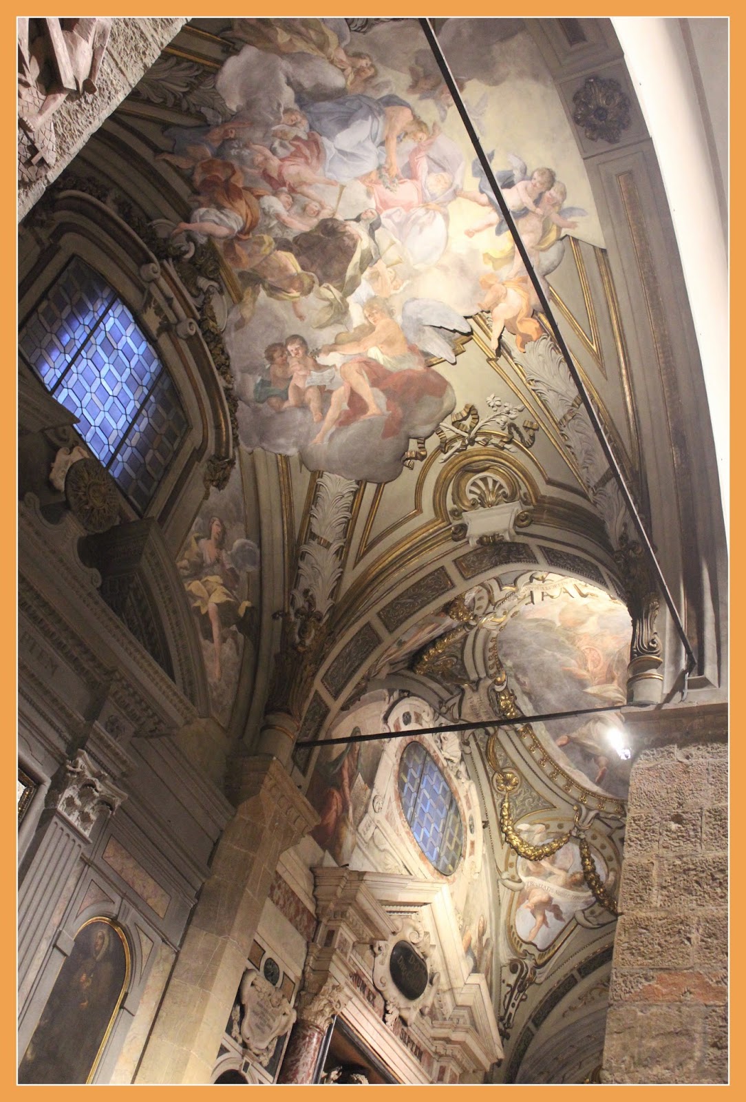 Apesar da sua simplicidade exterior e interior, devo dizer que fiquei absolutamente encantada com os frescos do tecto, muito ao estilo dos das igrejas de Roma.