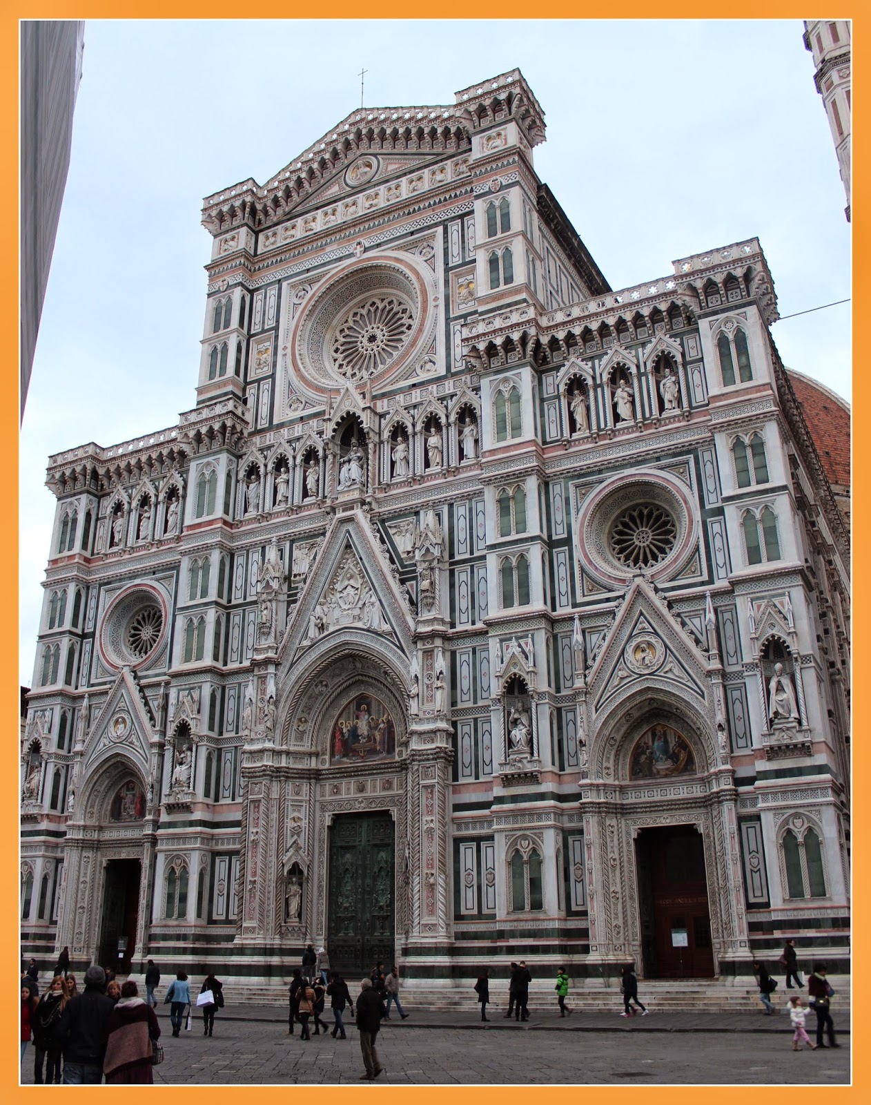 A sua construção neogótica demorou cerca de 140 anos, tendo sido iniciada em 1294. O seu exterior é uma fantástica combinação de mármores verdes, brancos e rosas, contudo, se o seu exterior surpreende pelo seu aspecto policromático, o mesmo não acontece no seu interior que prima pela simplicidade e que a mim me deixou um pouco desiludida. Pois depois de ver aquela fachada espectacular, as expectativas para o que se vai encontrar no interior é enorme e a verdade é que ela é quase desprovida de ornamentos interiores e é bastante sombria. Apesar de tudo, apresenta bonitas obras de arte que fazem parte do edifício em si. Nomeadamente, a Cúpula de Brunelleschi (que contém um fresco de Vasari e Zuccari, retratando o juízo final), o célebre fresco com o monumento equestre de John Hawkwood e o relógio colossal de Paolo Uccello.