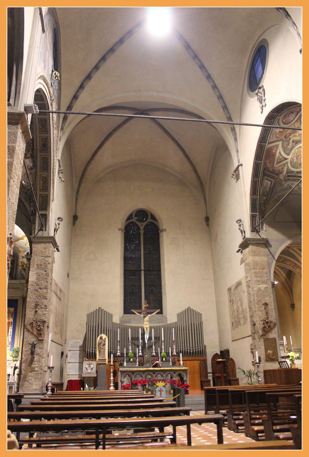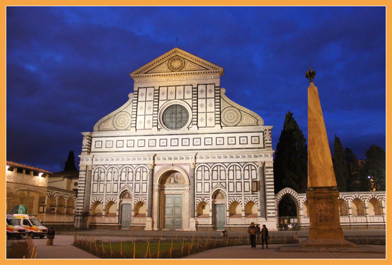 Contudo, antes de irmos jantar, decidimos ir até à Praça de Santa Maria Nova ver a A Basílica de Santa Maria Nova, uma das igrejas com maior importância da cidade. Iniciada no séc.XIII, foi projectada por dois frades dominicanos e vários foram os artistas que contribuíram para a construção e acervo da mesma (Filippo Brunelleschi, Botticelli, Paolo Uccello, Vasari e Pisano, entre outros), contudo, a mesma só ficou completa em meados do séc. XIV. De notar, que a sua fachada gótica original foi remodelada por Leão Battista Alberti, em 1470.