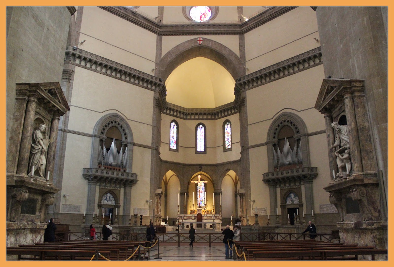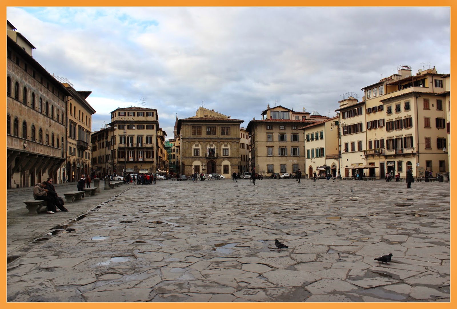 Seguimos depois em direcção à Praça de Santa Cruz, onde vimos a Basílica de Santa Cruz, uma das principais igrejas católicas do mundo. Esta foi mandada construir pelos franciscanos e acredita-se que foi fundada pelo próprio São Francisco de Assis e cuja intenção seria ter uma igreja maior que a Igreja de Santa Maria Novella. O interior da Basílica é um fantástico exemplo do gótico italiano e as suas características mais marcantes são as dezasseis capelas, tendo a maior parte delas frescos de Giotto e ainda os túmulos de Michelangelo, Maquiavel e Galileu Galilei.