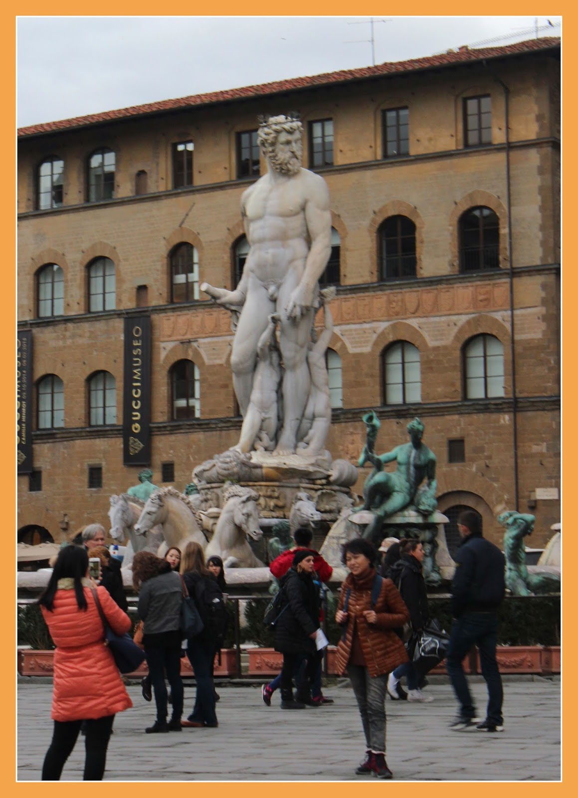 Logo após atravessarmos o átrio da Galeria dos Ofícios chegamos à Praça da Senhoria, um local bastante procurado pelos turistas, pois é uma verdadeira galeria de arte ao ar livre. Aqui podemos admirar maravilhosas obras de arte, que retratam os principais acontecimento históricos de Florença, como a réplica de David de Michelangelo (que comemora o triunfo sobre a tirania, através da personagem bíblica), a estátua de Netuno de Bartolomeo Ammannati e ainda a estátua de Hércules e Caco de Baccio Bandinelli ( que pretende retratar a vitória de Hércules sobre a maldade de Caco).