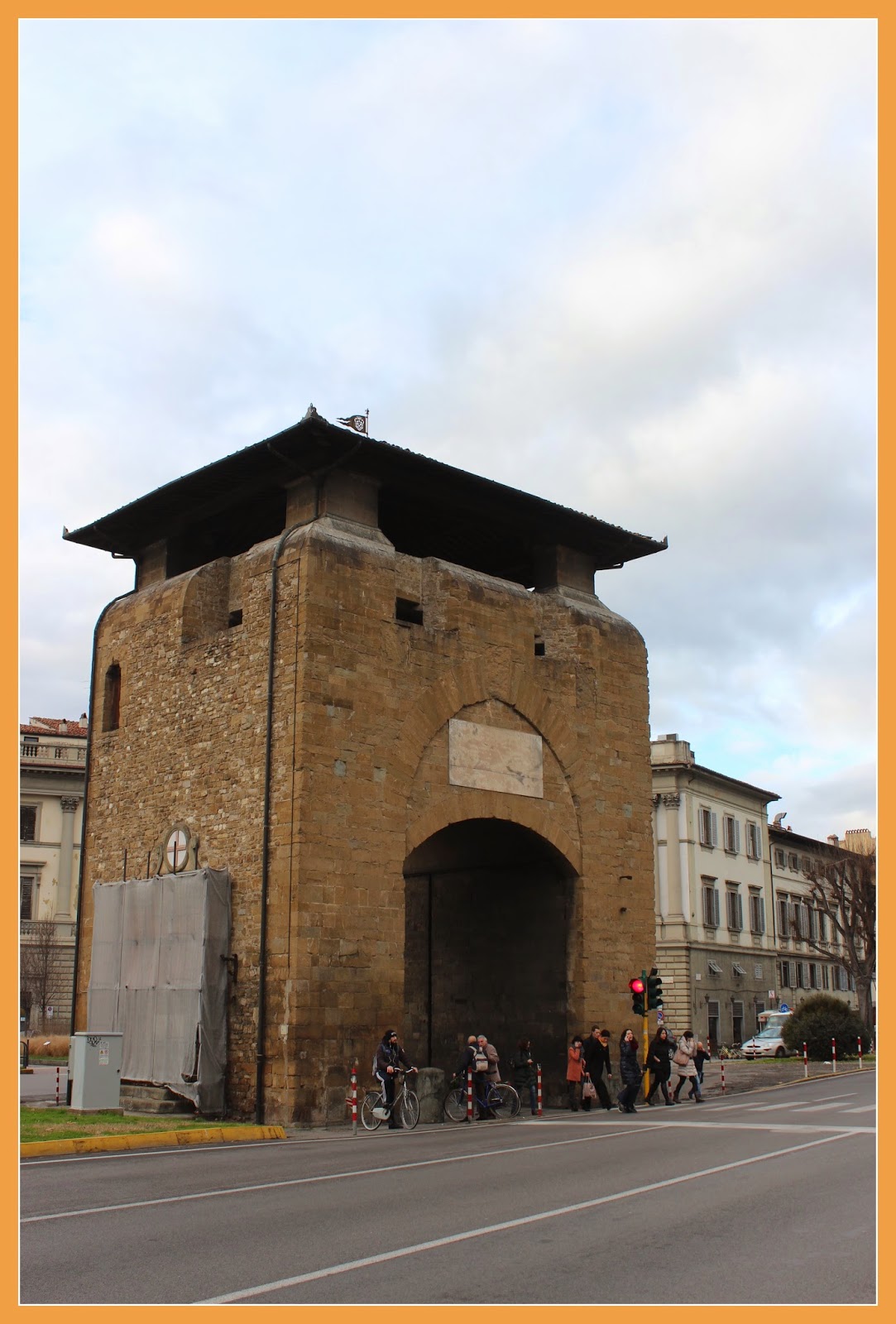 Depois de visitarmos tudo o que pretendíamos, nesta zona da cidade, voltámos a apanhar um autocarro e saímos na Piazza Beccaria, pois vimos uma estrutura que nos chamou a atenção e que era algo insólita, pois era uma estrutura isolada, que se localizava bem no meio de duas estradas. Era a Porta da Cruz, um dos portões dos muros de Florença do séc. XIII, que sobreviveram no tempo. Esta sofreu várias alterações ao longo dos anos, a mais notada foi no séc. XVI, quando foi reduzida a sua altura, com o objectivo de a adaptar às novas armas defensivas da guerra e ao mesmo tempo, tornar-se menos vulnerável a bombardeamentos.
