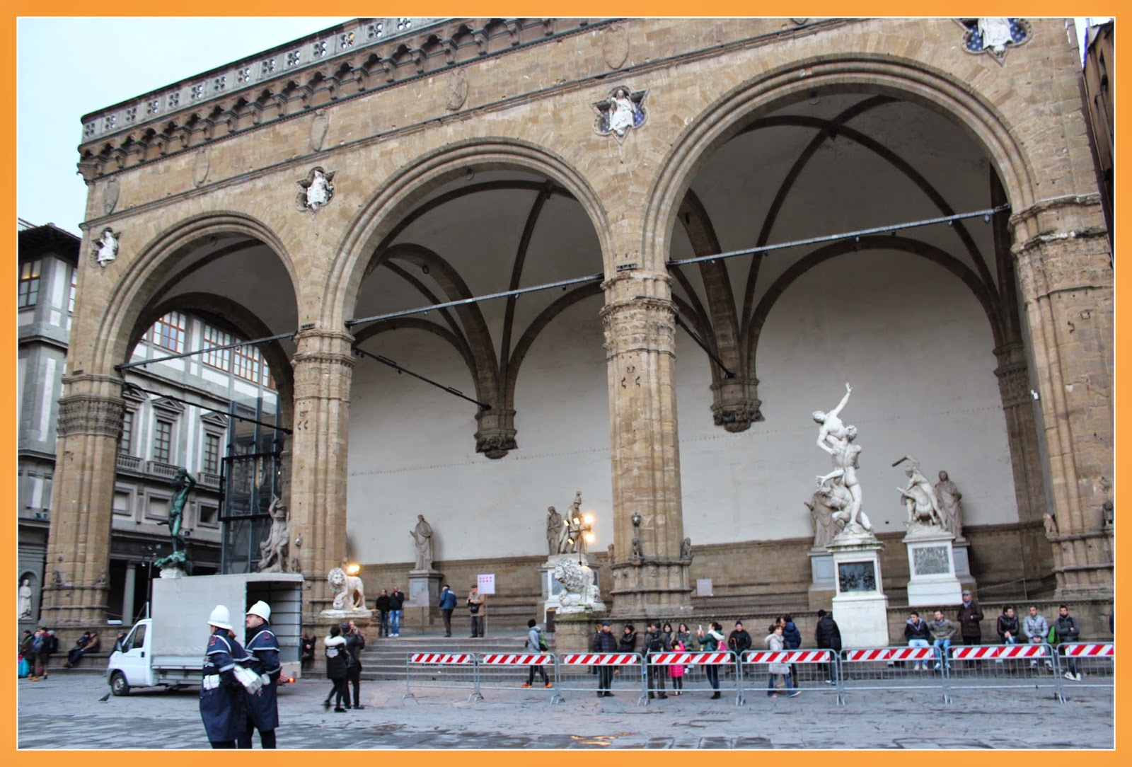 A Loggia dei Lanzi é um edifício construído no tempo da República como um espaço aberto onde os cidadãos assistiam às assembleias que se realizavam na Praça da Senhoria. Actualmente, é um local onde estão reunidas um conjunto de esculturas magníficas da cidade (na sua maioria réplicas). Este foi um dos locais dos quais não nos conseguimos aproximar muito, devido aos gradeamentos colocados para a manifestação.