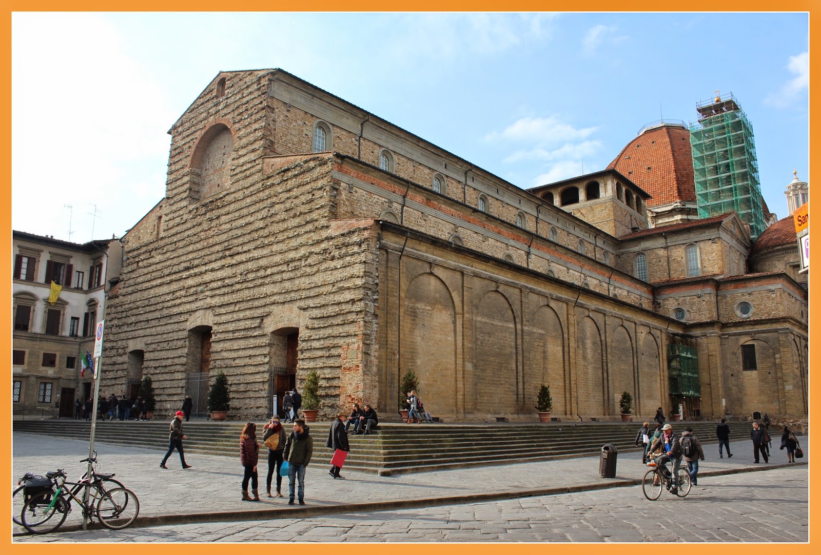 A Basílica do Espírito Santo foi a nossa próxima paragem. Esta é uma das principais igrejas de Florença do início do Renascimento. Foi construída sobre as ruínas de um convento, durante o séc. XIII, com o projecto de Filippo Brunelleschi. Contudo quando este morreu foram António Manetti, Giovanni da Gaiole e Salvi d’Andrea que continuaram a obra, sem no entanto fugir ao plano original, tendo sido Salvi d’Andrea o responsável pela construção da cúpula, projectada por Brunelleschi. Já o campanário é de Baccio d’Agnolo.