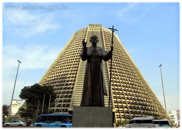 Catedral Metropolitana de São Sebastiãodo Rio de Janeiro. Com arquitetura moderna em formato de Cone, o altar fica ao meio sob a imensa cruz sustentada do teto por cabos de aço. Um monumento diferente de outras igrejas construídas.